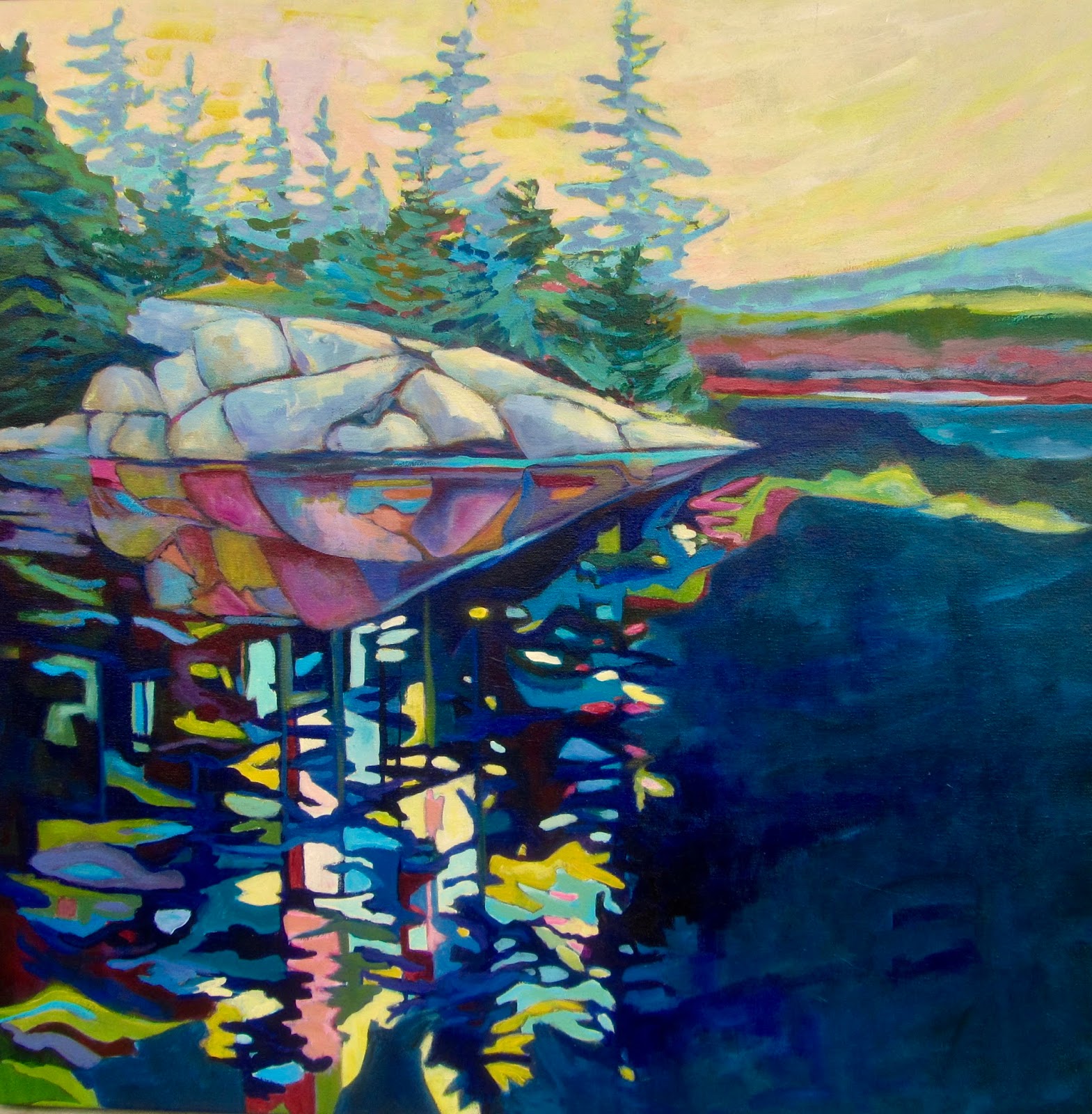 The third photo(above) shows the view I chose to paint. I knew right away I wanted to really simplify and push the forms of the trees to their geometric limits so that's how I began, but I also allowed the contour lines of the shapes to extend and overlap and intersect with the shapes next to them, and these lines then created an interesting overall composition of geometric shapes.